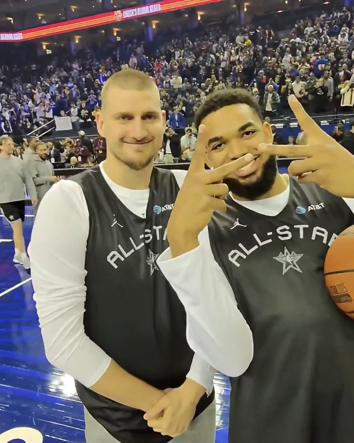 可愛捏!約基奇與唐斯在全明星現(xiàn)場合影 唐斯剪刀手&約老師姨母笑