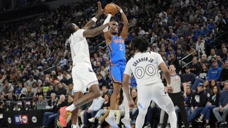 狼的策略很明確。沒有戈貝爾,狼擺出了一套五外陣容,外有華子開干,內(nèi)有里德大吃小,三人得分上20,五人得分上雙。防守則在聯(lián)防與夾擊誤持球人之間來回切換,擾亂SGA從三分線外持球發(fā)起的節(jié)奏,考驗雷霆的轉(zhuǎn)移球和外線回應(yīng)。攻防兩端,狼都打到了雷霆的痛點。