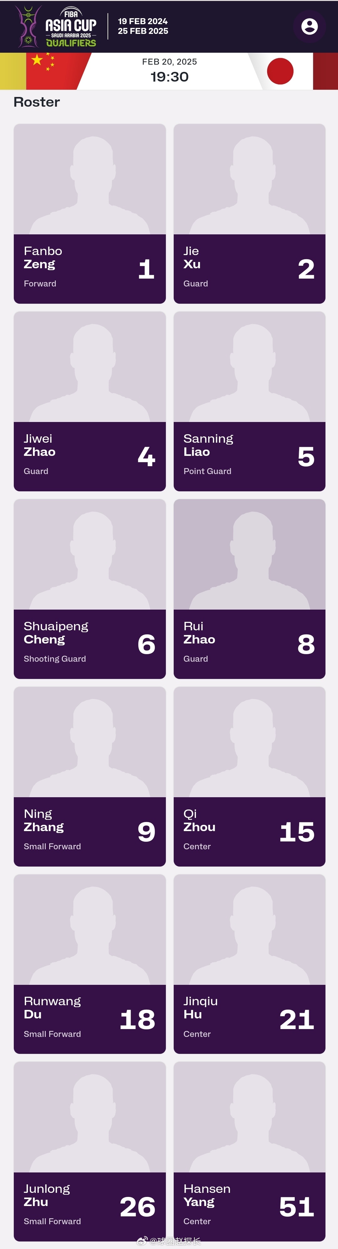 02月19日訊 亞預賽官網(wǎng)更新了中國男籃20日對陣日本隊的12人名單,詳情如下: