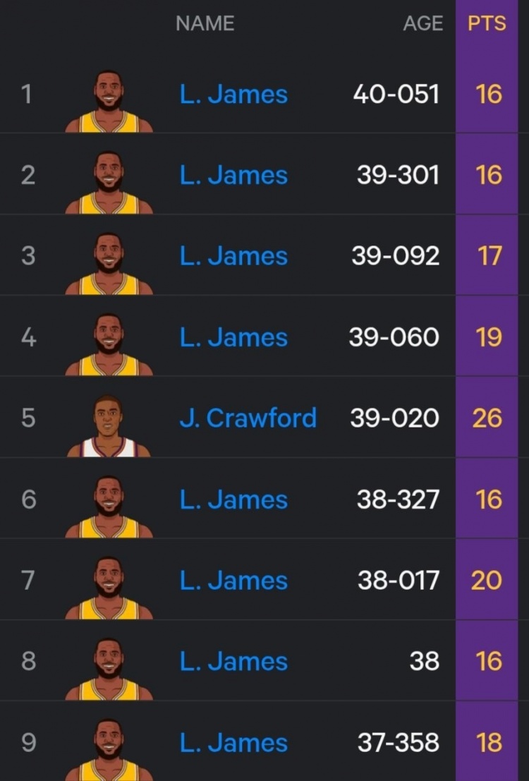 至此,40歲51天的詹姆斯再次刷新了自己保持的歷史最老末節(jié)得分16+紀(jì)錄,此前創(chuàng)紀(jì)錄時詹姆斯39歲301天。