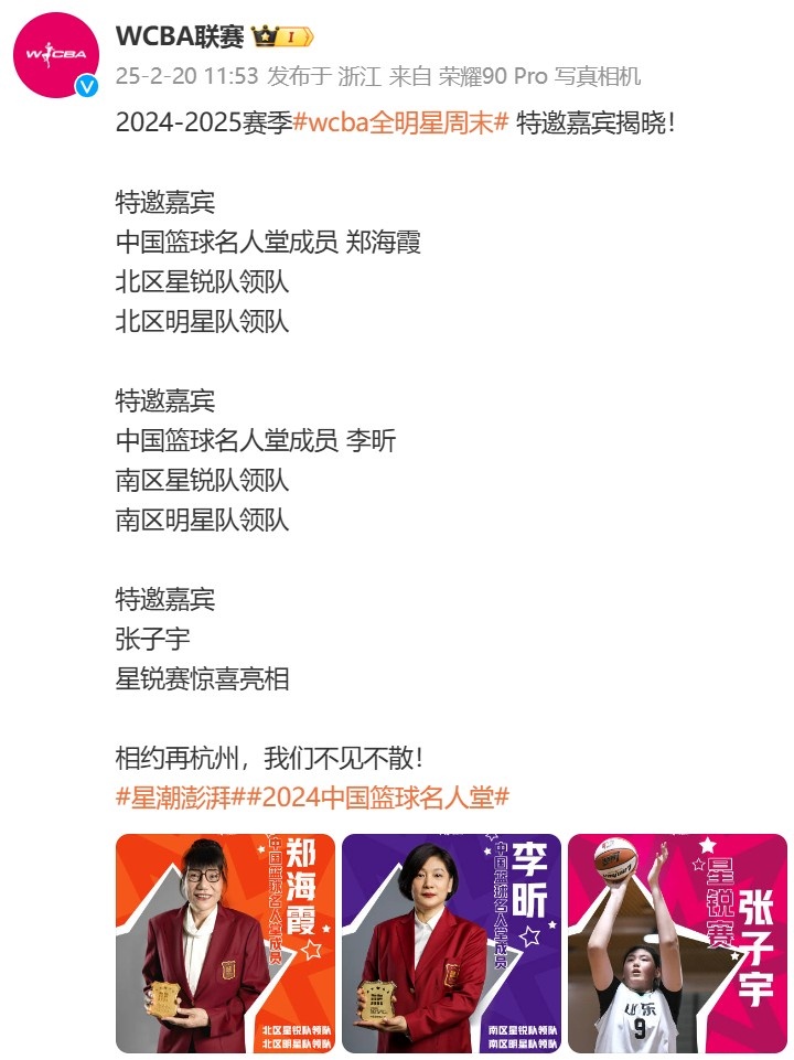2月20日訊 本周末,本賽季的WCBA全明星賽將會(huì)在杭州黃龍?bào)w育中心舉行。WCBA聯(lián)賽官方微博發(fā)文公布了三位特邀嘉賓,分別是鄭海霞、李昕和張子宇,原文如下: 標(biāo)簽: CBA 中國籃球 籃球 WCBA