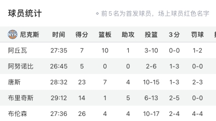 三節(jié)結束時,尼克斯落后31分,末節(jié)錫伯杜沒再讓先發(fā)球員登場,首發(fā)五虎的出場時間都在20+。