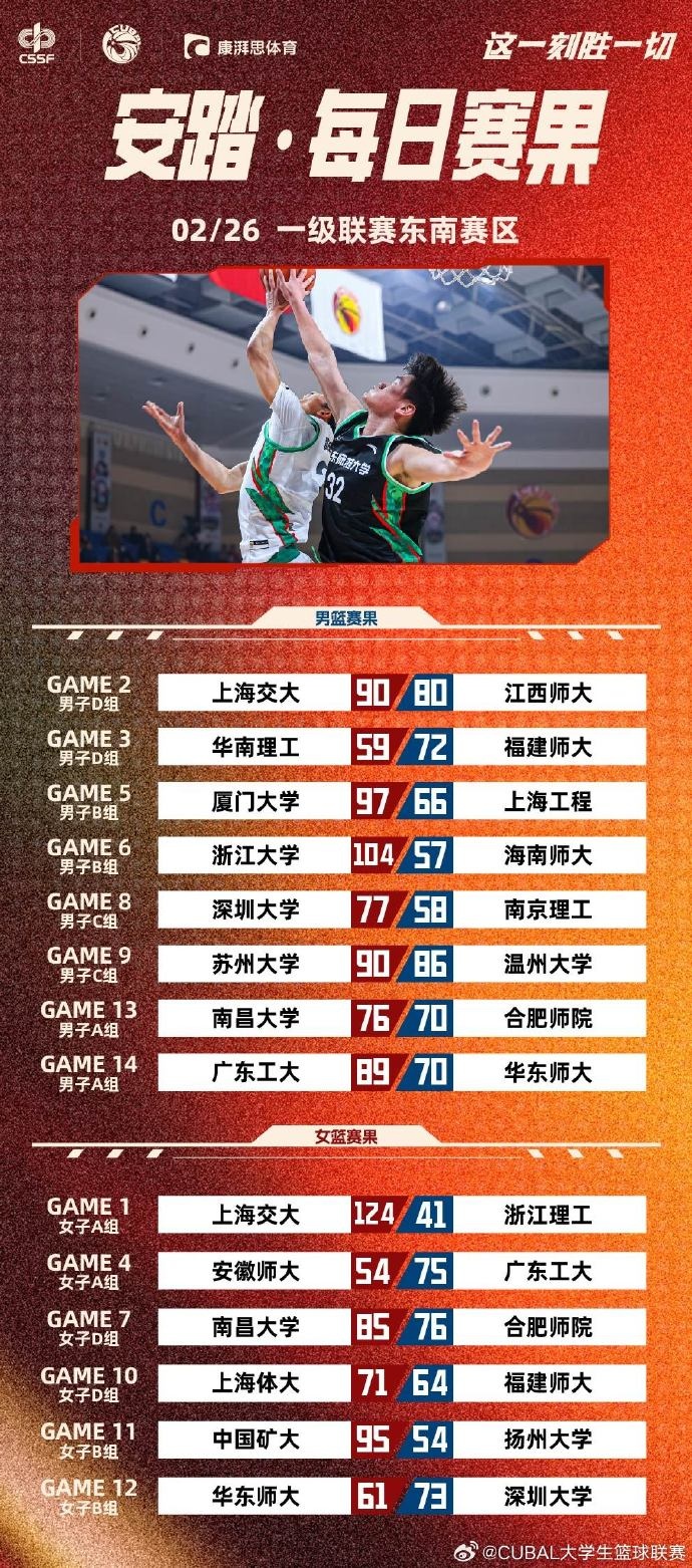男籃方面,上海交大10分之差險(xiǎn)勝江西師大,福建師大初生牛犢不怕虎10名大一新生拿下首勝,廈門大學(xué)、浙江大學(xué)、深圳大學(xué)均大勝對(duì)手。蘇州大學(xué)南昌大學(xué)以微弱優(yōu)勢拿下首勝。而在最受關(guān)注的揭幕戰(zhàn)上,廣東工業(yè)大學(xué)在曾煜成的精彩發(fā)揮下戰(zhàn)勝華東師大,取得小組賽首勝!