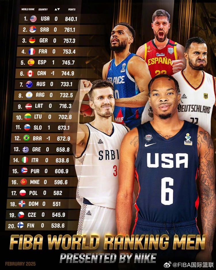 美國隊(duì)、塞爾維亞隊(duì)、德國隊(duì)、法國隊(duì)繼續(xù)穩(wěn)居前4;西班牙隊(duì)超越加拿大隊(duì)升至第5。澳大利亞隊(duì)排名第7,是世界排名前20中唯一的亞大區(qū)球隊(duì)。