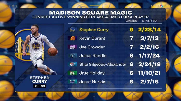 現(xiàn)役球員在尼克斯主場連勝榜:庫里9連勝第1 杜蘭特7場并列第2