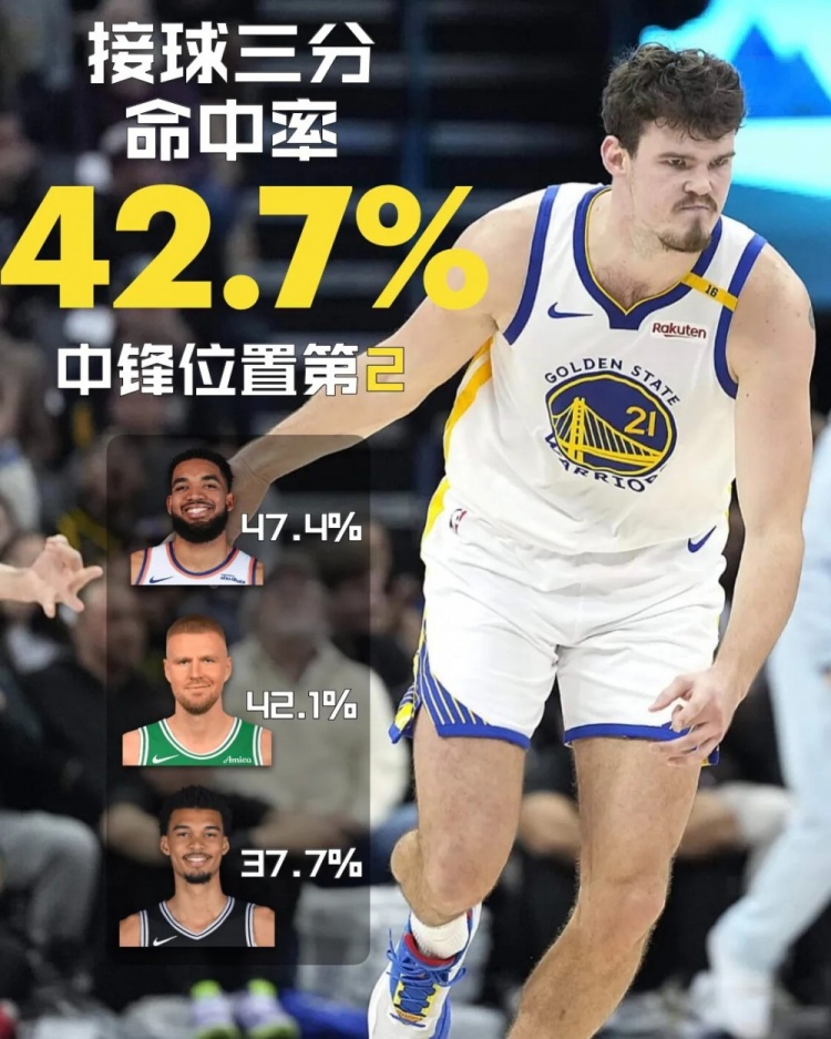 賽季至今,波斯特每場要完成3.7次三分線外的接球投籃,而他命中率高達42.7%。這個效率在全聯盟出手至少在3.5次的大個子里,僅次于唐斯。