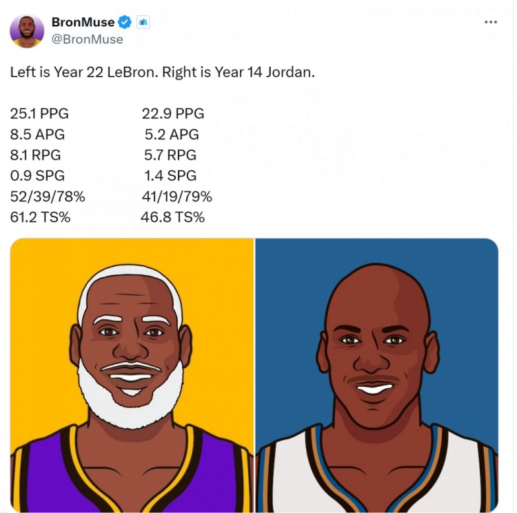第22季詹姆斯場(chǎng)均25.1分8.1籃板8.5助攻,三項(xiàng)命中率52/39/78%,真實(shí)命中率61.2%;