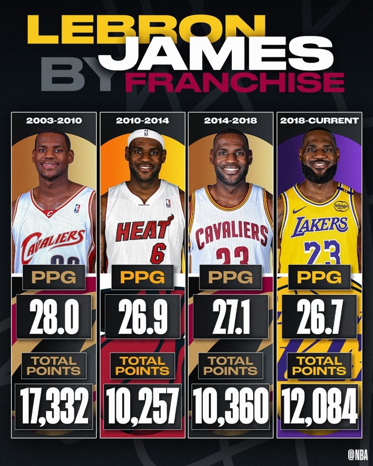 詹姆斯生涯四個階段總得分均破萬 各階段場均得分差距不大