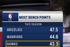 本賽季替補得分前3球隊:灰熊47.5分第1 勇士44.6第2 老鷹43.3第3