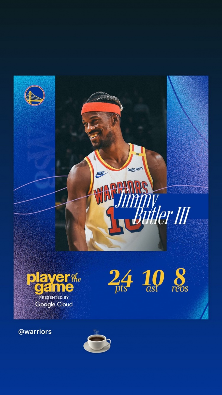 賽后,勇士官方評選巴特勒為本場最佳球員。庫里轉(zhuǎn)發(fā)并配上咖啡表情“??”