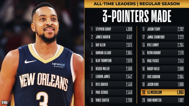 生涯能到多少?CJ三分命中數(shù)1983 超越諾維茨基升至歷史第19