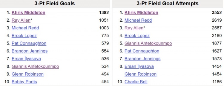 據(jù)統(tǒng)計,米德爾頓在雄鹿生涯三分出手3552次,命中1382記,都是隊史紀錄。