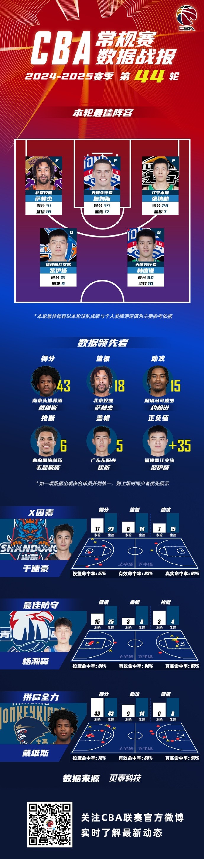 數(shù)據(jù)領(lǐng)先者方面:南京同曦籃球俱樂部球員戴維斯以單場(chǎng)43分的數(shù)據(jù)領(lǐng)銜得分榜;