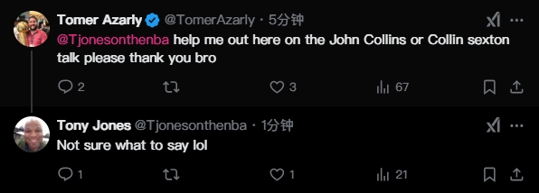 02月06日訊 快船記者Tomer Azarly發(fā)推向爵士記者Tony Jones求助:“哥們,快幫我問(wèn)問(wèn)科林斯和塞克斯頓的情況咋樣?謝謝你了好兄弟!”