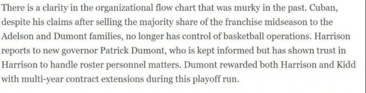 2024年6月底,選秀大會(huì)前夕,據(jù)ESPN的麥克馬洪報(bào)道,庫班已經(jīng)不再參與獨(dú)行俠隊(duì)的運(yùn)營工作,而由獨(dú)行俠隊(duì)的總經(jīng)理哈里森,直接向新老板杜蒙特匯報(bào)。