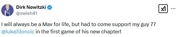 獨行俠名宿諾維茨基現(xiàn)場觀戰(zhàn),他發(fā)推寫道:“我永遠(yuǎn)都是獨行俠的一員,但我今天得來支持我的兄弟東契奇,看他開啟生涯新篇章的第一場比賽!”