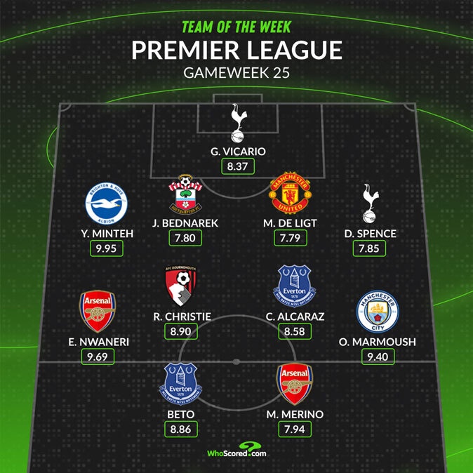 2月17日訊 英超第25輪比賽戰(zhàn)罷,WhoScored列出了本輪最佳陣容,梅里諾、恩瓦內(nèi)里、馬爾穆什、德里赫特在列。