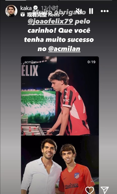 卡卡也對(duì)此進(jìn)行了感謝,他寫道:“感謝若昂的贊美!祝愿你在米蘭能夠取得巨大的成功。”