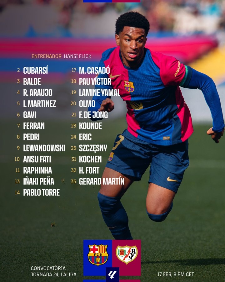 2月17日訊 北京時(shí)間明天凌晨4點(diǎn),巴薩將在西甲主場(chǎng)迎戰(zhàn)巴列卡諾,球隊(duì)今天公布了比賽名單,具體如下: