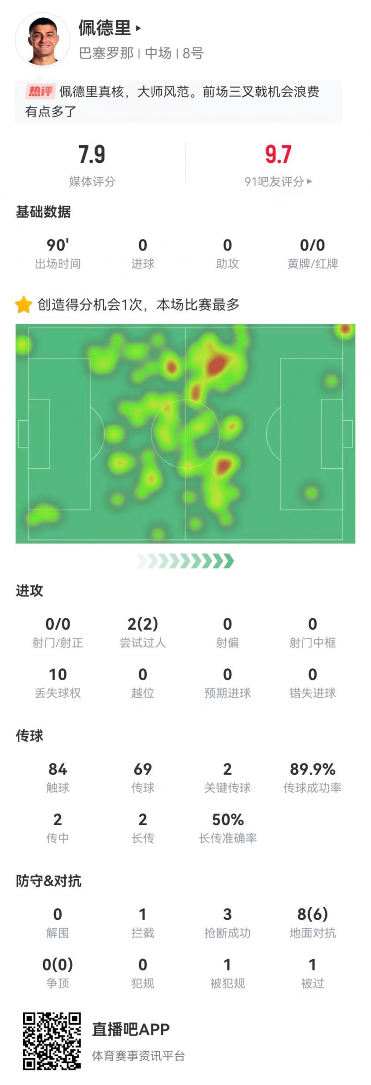 官方:佩德里當(dāng)選MVP,2關(guān)鍵傳球1造良機(jī) 7對(duì)抗5成功 7.9分最高