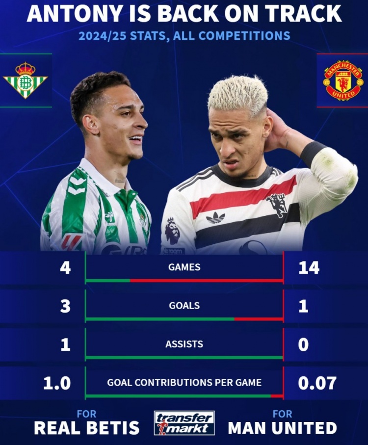 數(shù)據(jù)統(tǒng)計(jì)顯示,安東尼在冬窗加盟貝蒂斯后4場(chǎng)貢獻(xiàn)3球1助攻,場(chǎng)均直接參與1球。