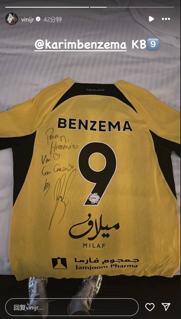 維尼修斯獲贈(zèng)本澤馬的簽名球衣,他在社交媒體上曬出球衣,配文:“本澤馬,KB9?!?/p>
