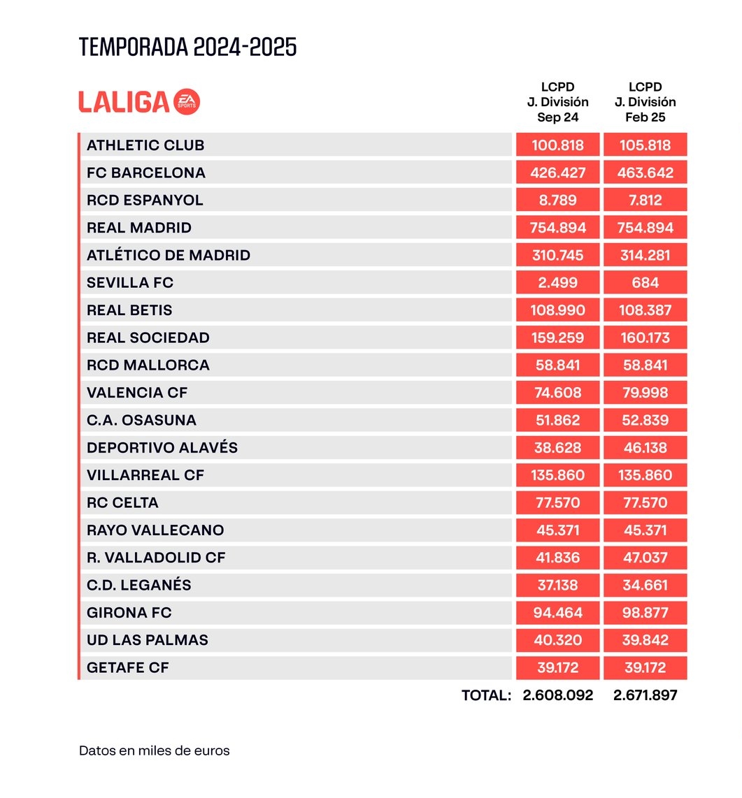 2月19日訊 西甲官方在冬窗后更新了更新的各隊(duì)工資帽,皇馬7.55億歐居首,巴薩4.64億歐第二。