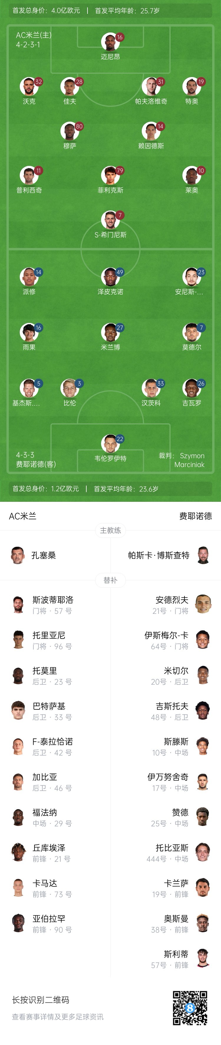 米蘭首發(fā):16-邁尼昂、32-沃克、28-佳夫、31-帕夫洛維奇、19-特奧、80-穆薩、14-賴因德斯、11-普利西奇、79-菲利克斯、10-萊奧、7-S-希門尼斯
