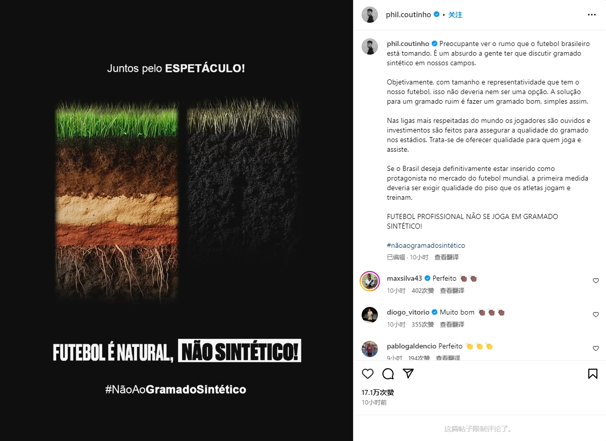 02月19日訊 內馬爾、庫蒂尼奧、蒂亞戈-席爾瓦等人社媒發(fā)布相同的長文,對巴西足球球場使用人工草皮進行批評。
