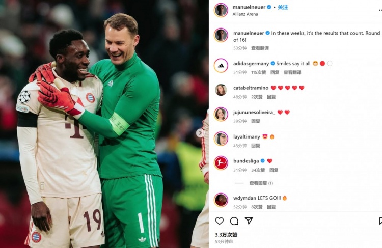 諾伊爾曬出自己和進球功臣戴維斯的合照,并配文:“在最近幾周,結(jié)果才是最重要的。晉級16強!”