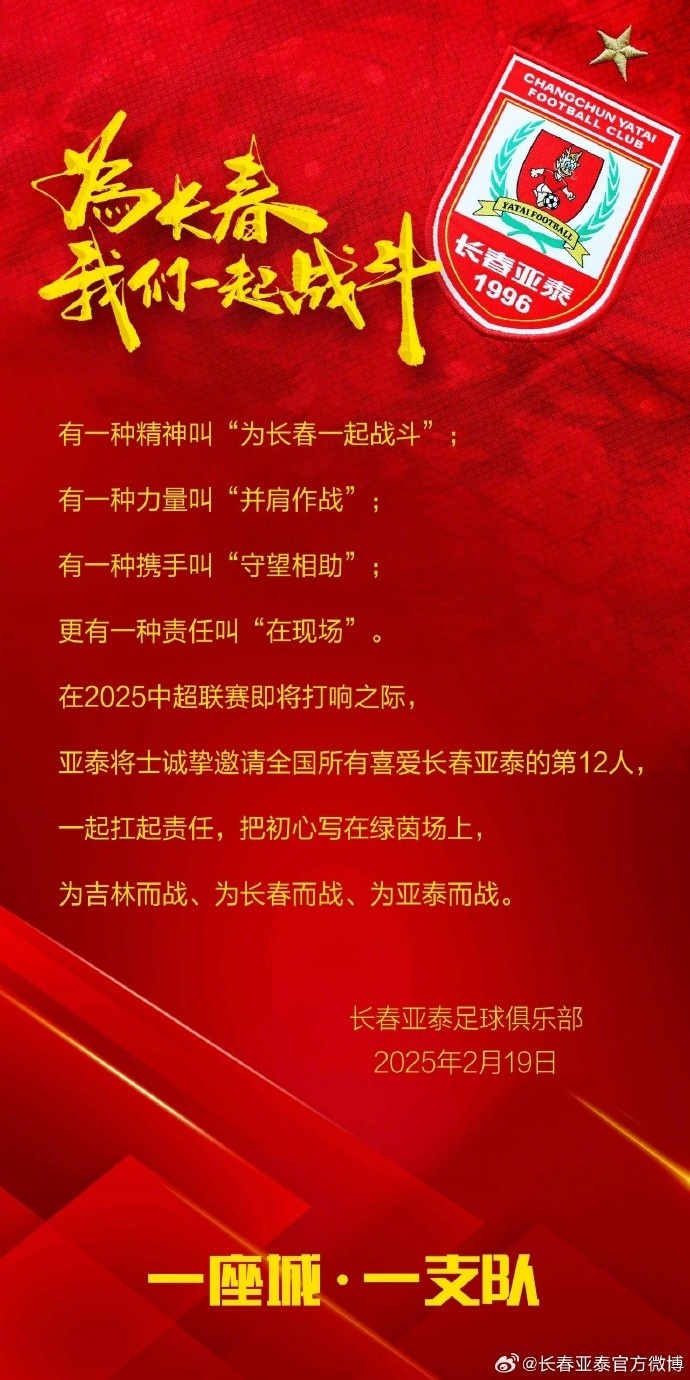 2月19日,正在上海備戰(zhàn)的長春亞泰舉行了以“為長春一起戰(zhàn)斗”為主題的2025賽季華潤飲料中超聯(lián)賽出征儀式。俱樂部總經(jīng)理曾皎峰受吉林省體育局、長春市體育局委托,向亞泰將士授旗,希望亞泰將士與第12人一起扛起責(zé)任,把初心寫在綠茵場上,為吉林而戰(zhàn)、為長春而戰(zhàn)、為亞泰而戰(zhàn)。“長春亞泰是中國職業(yè)足球俱樂部中為數(shù)不多的,有著悠久的歷史傳承的俱樂部。新賽季即將打響,我們團(tuán)隊中的每個人要滿懷信心,時刻秉記責(zé)任、使命,為這個優(yōu)秀的集體做出自己的貢獻(xiàn),贏得榮譽。”主教練謝暉說。