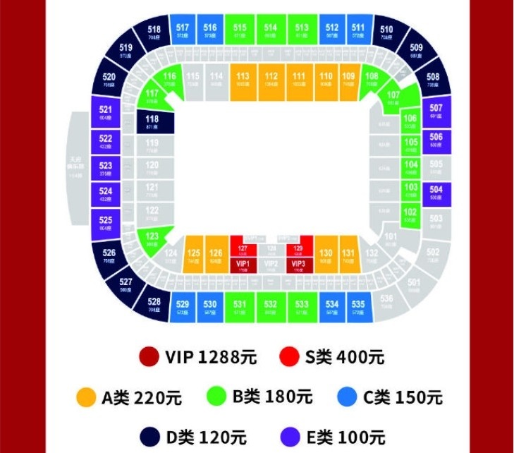 本場比賽票價分為7檔,從低到高分別為100元、120元、150元、180元、220元、400元、1288元。