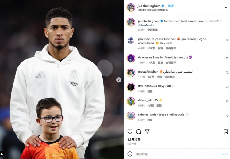 2月20日訊 皇馬在本輪歐冠3-1擊敗曼城,得以挺進歐冠16強戰(zhàn),貝林厄姆首發(fā)踢滿全場。貝林厄姆也在賽后通過社媒曬出自己的比賽照,并配文:“任務(wù)完成!晉級下一輪。我愛這支球隊!” 標簽: 足球 西甲 皇家馬德里 英超 曼城 歐冠