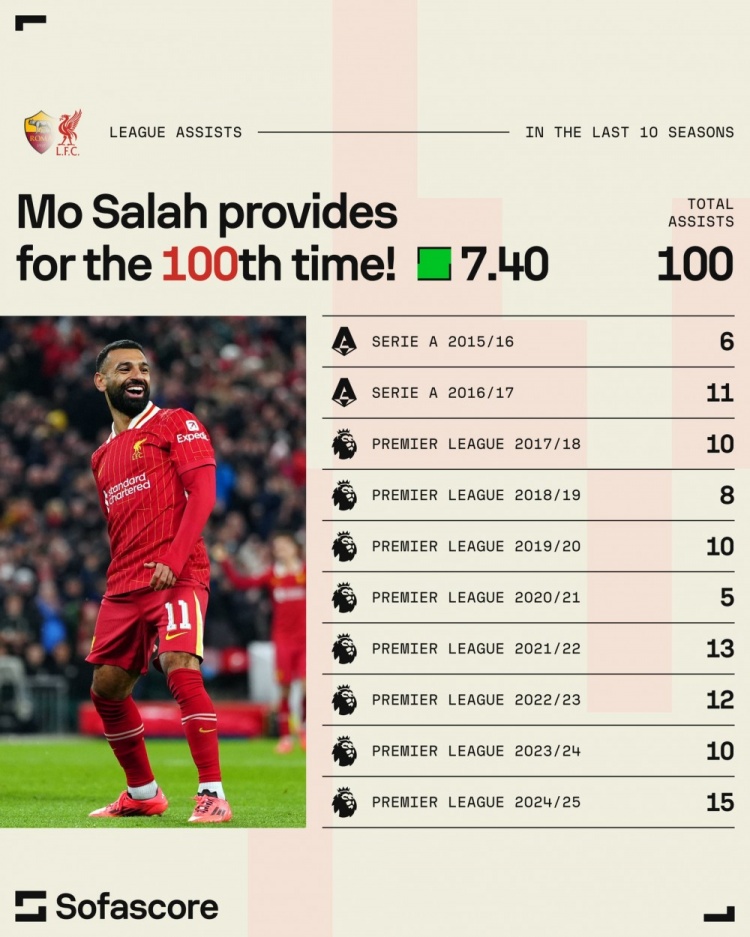 此外,在近10個(gè)賽季中,薩拉赫在聯(lián)賽中的助攻總數(shù)已經(jīng)達(dá)到了100次,他是五大聯(lián)賽中第四位做到這一點(diǎn)的球員。此前三位分別是德布勞內(nèi)(117助攻)、穆勒(116助攻)和梅西(110助攻)。