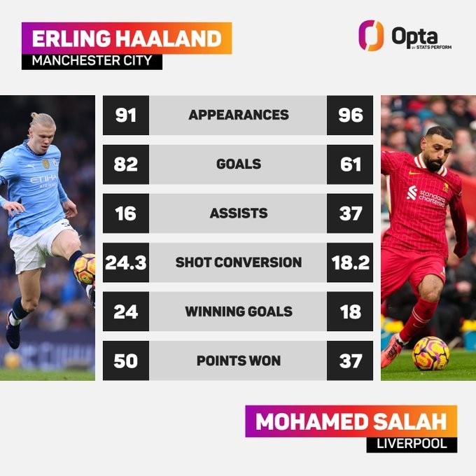 2月21日訊 OPTA統(tǒng)計了薩拉赫和哈蘭德過去三個賽季的進球數據,兩人都在英超參與了98個進球,分別為曼城和利物浦贏得50分和37分。