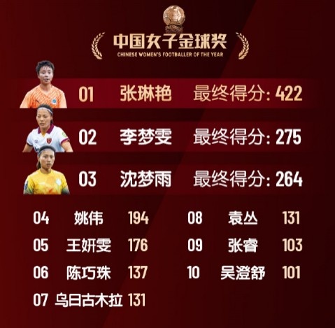 2月21日訊 《足球周刊》公布了本次中國金球獎各獎項(xiàng)評選具體得分,其中中國金帥獎方面于根偉斷層領(lǐng)先,中國女子金球獎則是張琳艷同樣較大優(yōu)勢領(lǐng)跑。