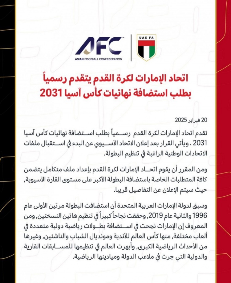 官方:阿聯(lián)酋足協(xié)申辦2031年亞洲杯