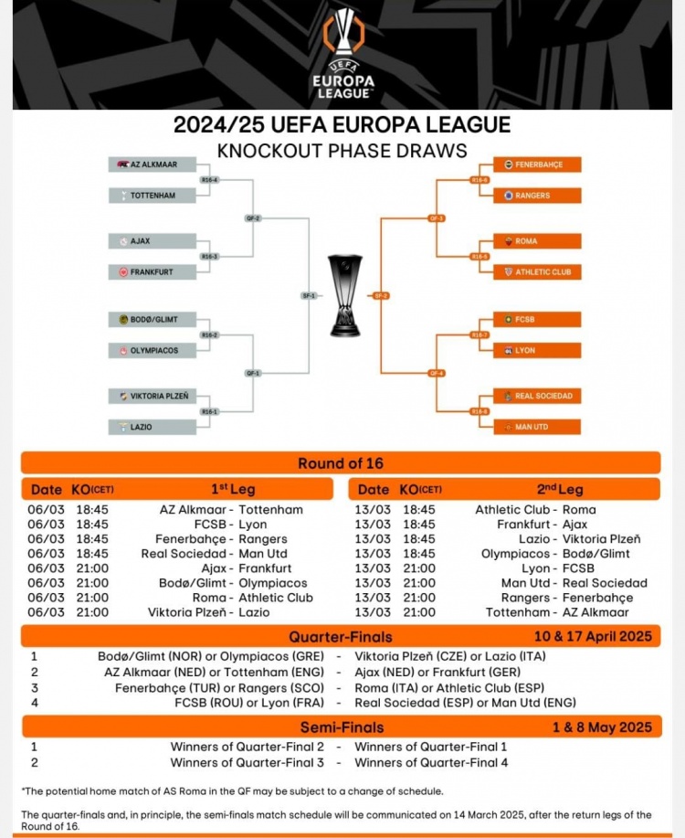 2月22日訊 歐足聯(lián)官方公布了歐聯(lián)杯1/8決賽的開球時間,首回合皇家社會vs曼聯(lián)3月7日1點45分開球,羅馬vs畢爾巴鄂3月7日4點開球。