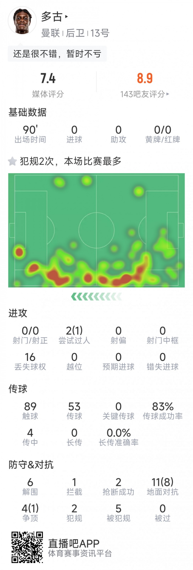 2月22日訊 在本輪英超,曼聯(lián)2-2戰(zhàn)平埃弗頓。新援多古表現(xiàn)可圈可點,以下為他在本場數(shù)據(jù):