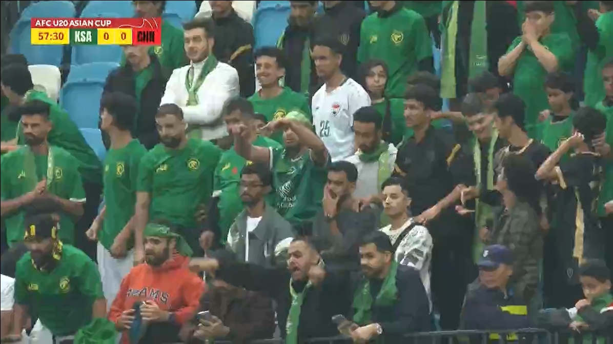 看臺沙特球迷目睹主裁判給中國隊點球,比劃手抗議示意看VAR