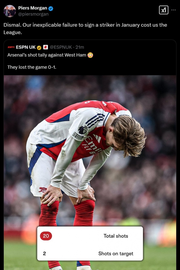 本場(chǎng)比賽,阿森納狂轟了20腳射門,但只有2次射正。摩根轉(zhuǎn)發(fā)了這一數(shù)據(jù),并寫道:太差勁了。我們一月份莫名其妙地沒能簽下一名前鋒,這導(dǎo)致我們丟掉了聯(lián)賽冠軍。