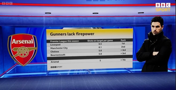 BBC也盤點了本賽季英超球隊場均射正次數(shù)榜,利物浦6.5次居首,曼城6.1次第二,切爾西與伯恩茅斯5.8次并列第三,而阿森納5次僅能夠并列排在第7。