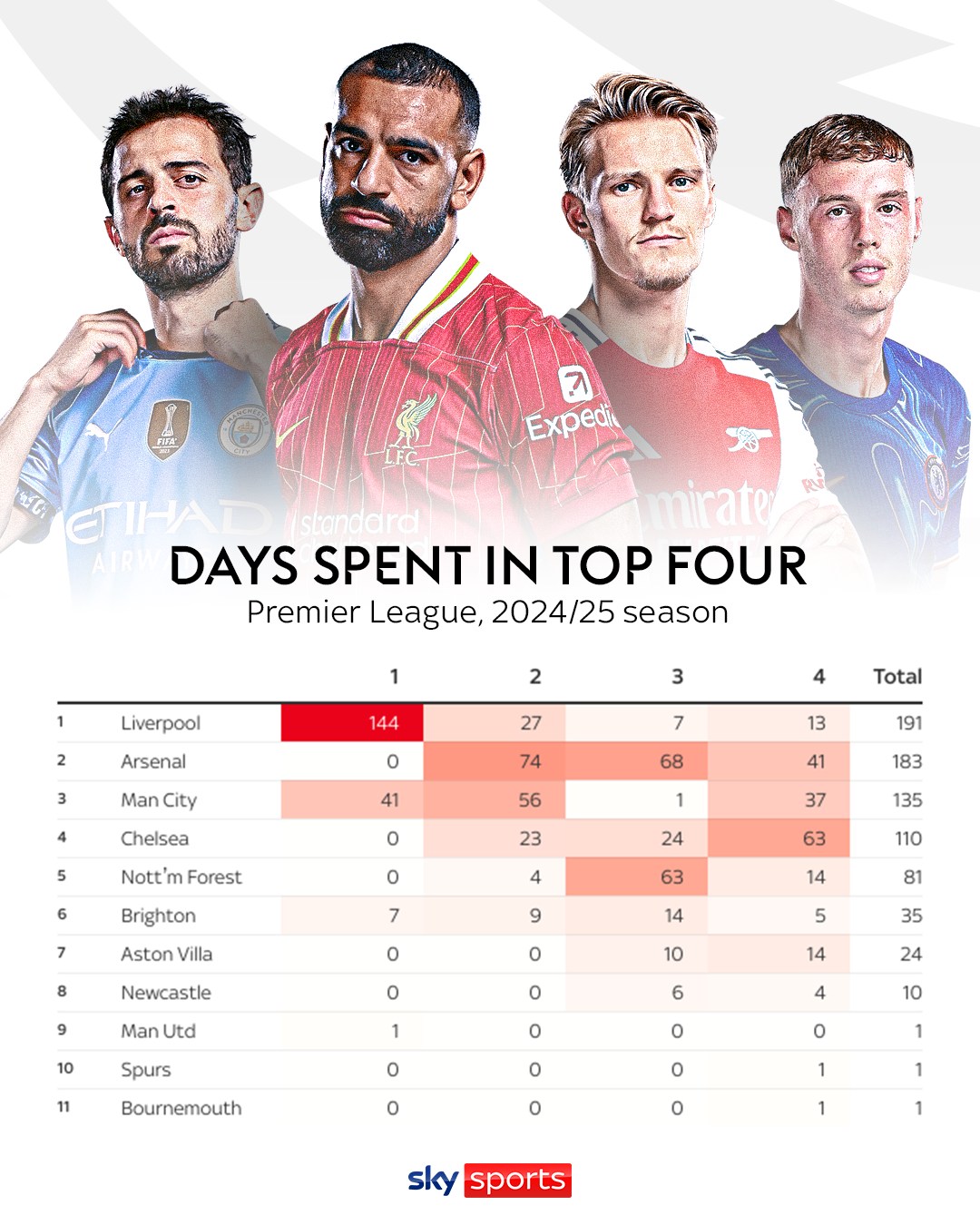曼城共有41天呆在榜首,布萊頓7天。曼聯(lián)也有1天呆在榜首,但除這一天外未進(jìn)入過(guò)前四。