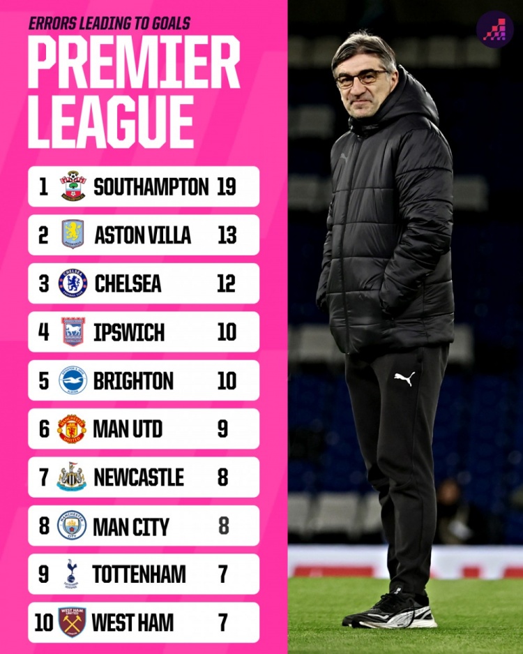 2月26日訊 根據(jù)統(tǒng)計(jì),南安普頓本賽季在英超因失誤丟掉19球,所有球隊(duì)最多,比第二名維拉多出6球。目前在英超積分榜,南安普頓積9分墊底。