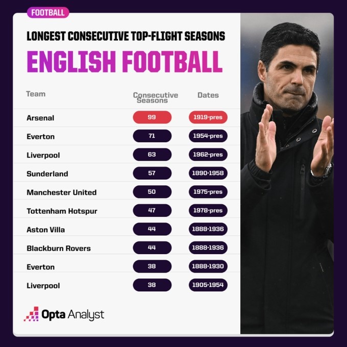 阿森納自1919年開(kāi)始一直在英格蘭頂級(jí)聯(lián)賽征戰(zhàn),下賽季他們將在英格蘭頂級(jí)聯(lián)賽連續(xù)征戰(zhàn)100個(gè)賽季,是連續(xù)征戰(zhàn)頂級(jí)聯(lián)賽時(shí)間最長(zhǎng)的英格蘭球隊(duì)。