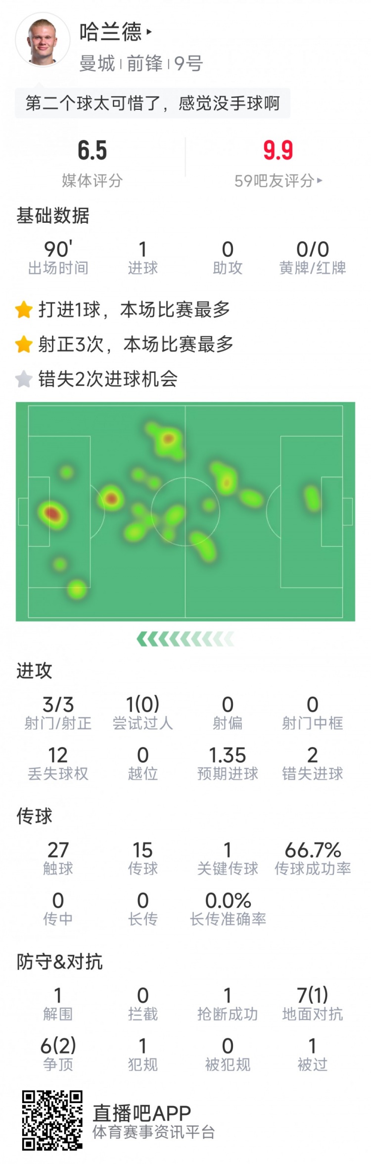 2月27日訊 在本輪英超,曼城1-0擊敗熱刺,哈蘭德破門。以下為他在本場(chǎng)數(shù)據(jù):