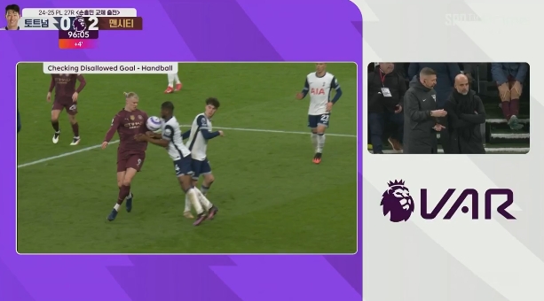 2月27日訊 英超第27輪,熱刺vs曼城。比賽補(bǔ)時(shí)階段,哈蘭德破門!隨后VAR介入,哈蘭德、丹索均有手球嫌疑,最終進(jìn)球被判無效!