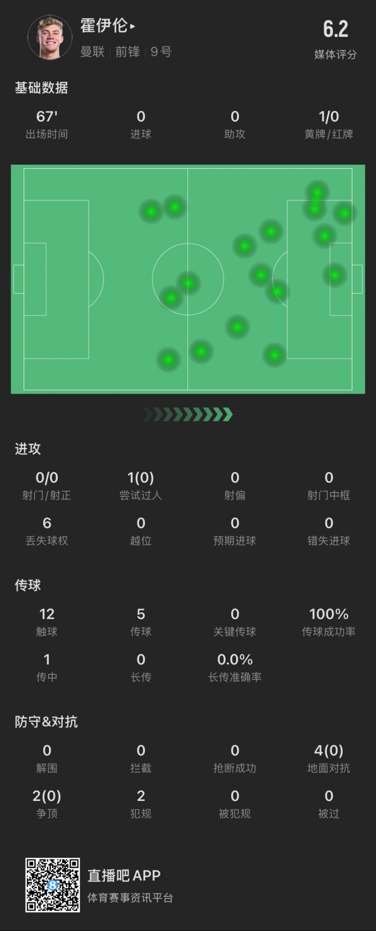 霍伊倫本場:射門關(guān)鍵傳球等數(shù)據(jù)掛零,6次對抗0成功,僅觸球12次