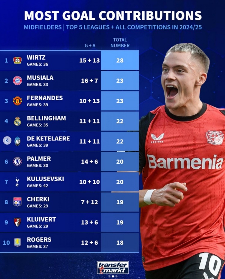 本賽季五大聯(lián)賽中場球員參與進球榜:維爾茨居首,穆西亞拉次席