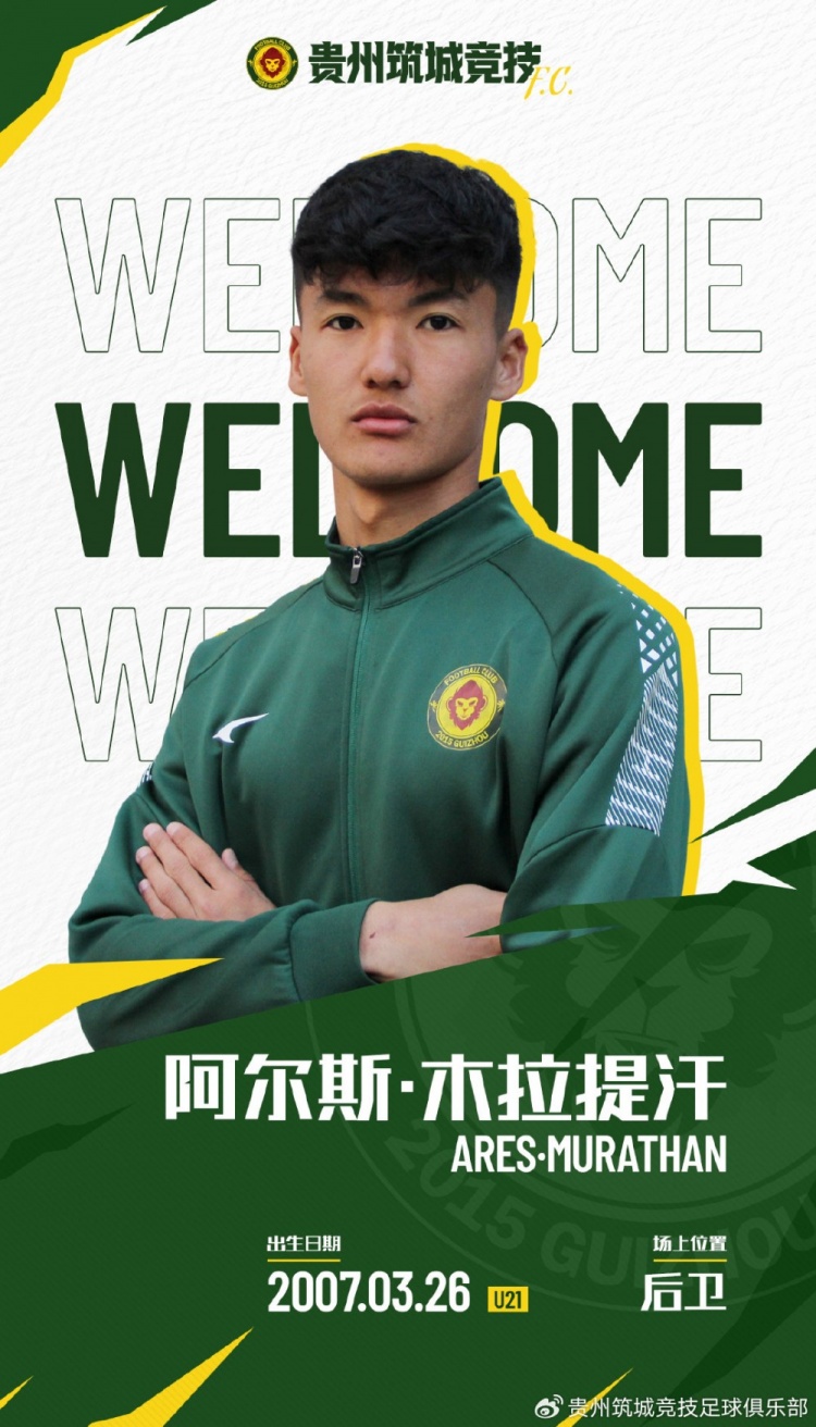 ??經(jīng)與球員協(xié)商一致,阿爾斯-木拉提汗正式加盟貴州筑城競技足球俱樂部。阿爾斯-木拉提汗2007年3月26日出生于新疆烏魯木齊,身高192cm,體重80kg,司職中后衛(wèi)。